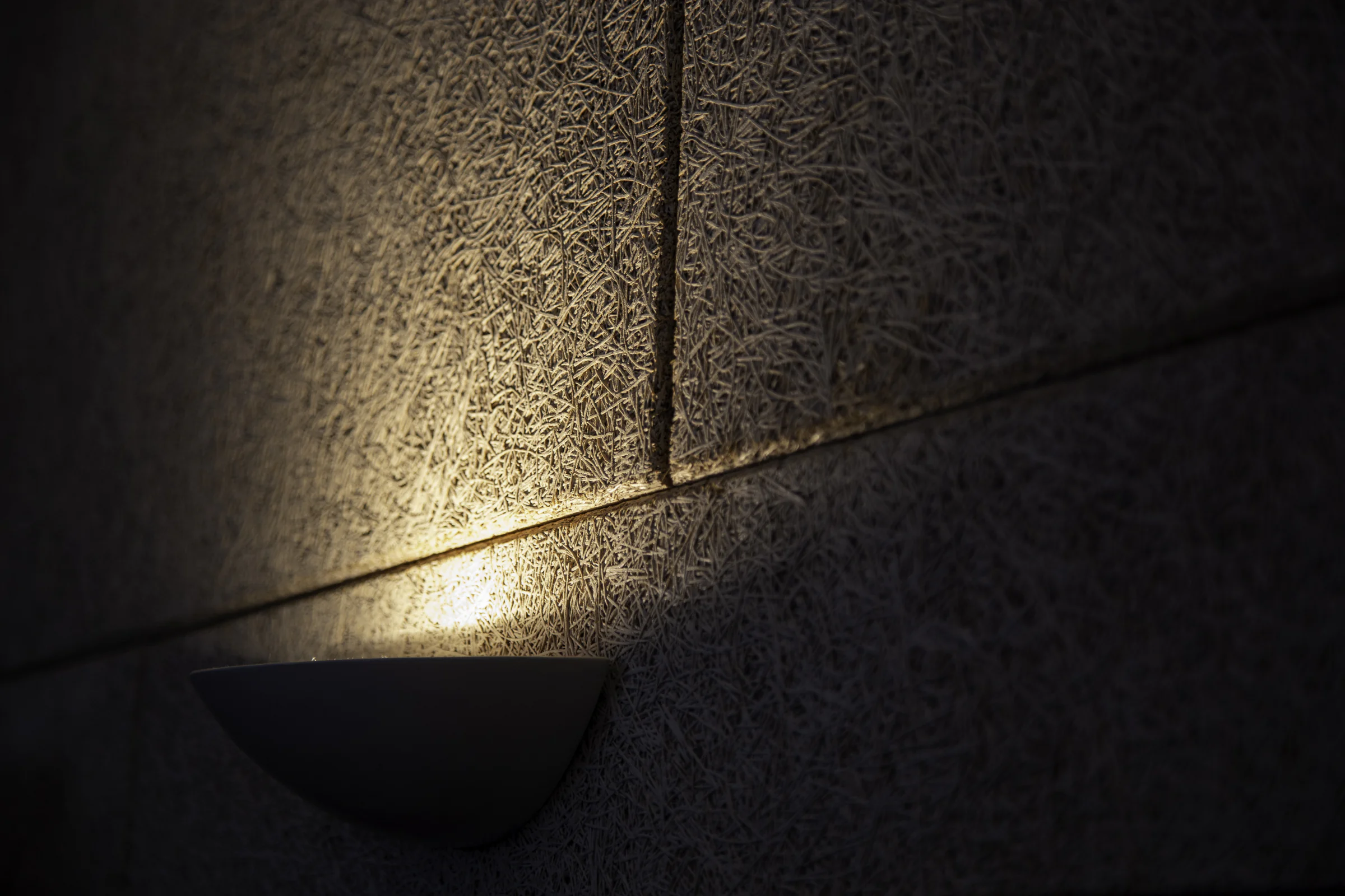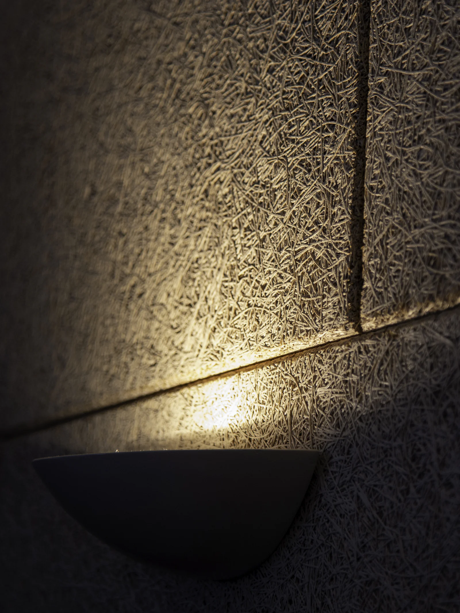 Waschtisch: Zeder, Mineralguss, Schiebetüren aus lackiertem Glas – Montiert vor Sichtbeton