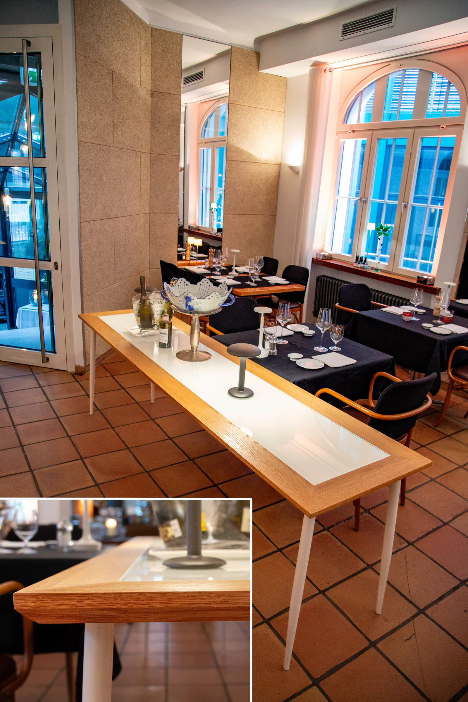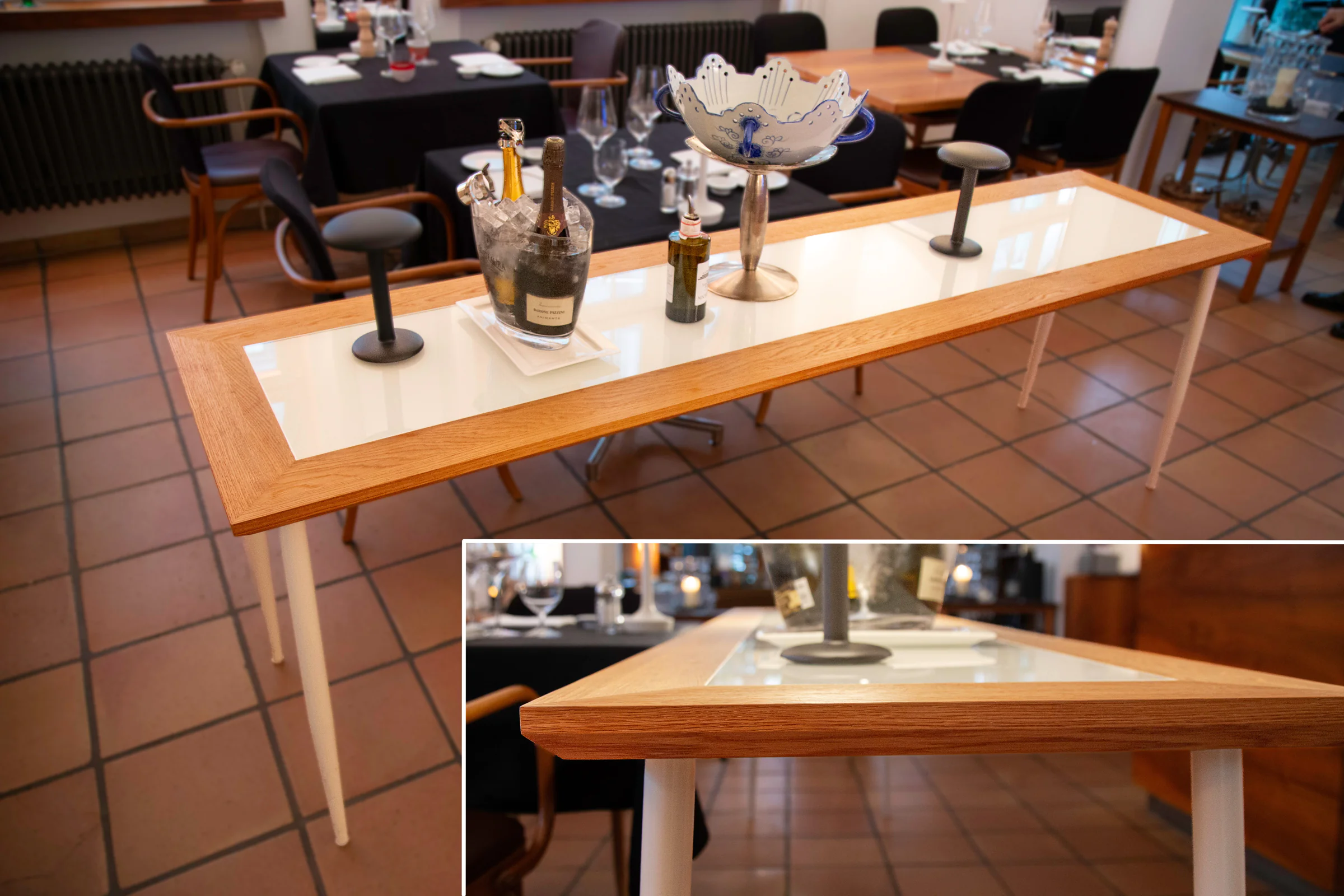 Arbeitstisch im Ristorante La Fenice, Stuttgart Mitte. Eiche massiv auf Stahlrahmen, Einsatz aus lackiertem Glas